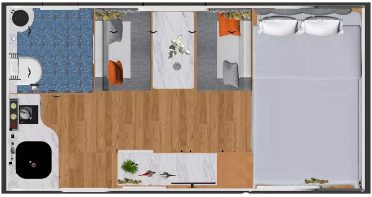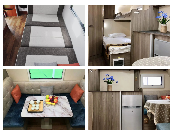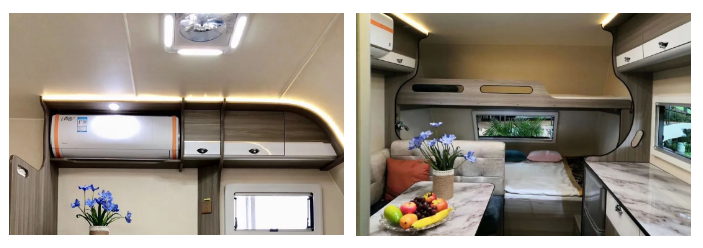 1400*2000mm的固定双人床,整车可供4-5人休息,整车共7个车窗,不论是采光还是空气流通都起到很好的效果,外置行车空调冬暖夏凉,车内暖色调氛围灯使整车温馨舒适,车顶换气扇让空气流通的同时又能拥有丝丝凉意,整车内饰实用又美观。