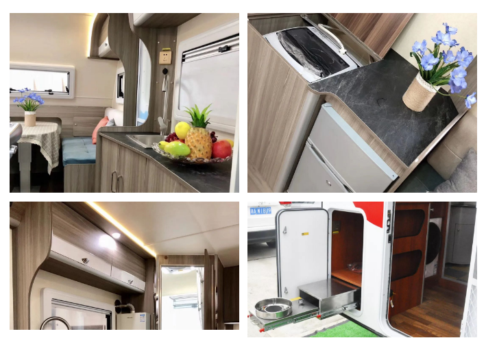 整车布局巧妙,进入车内是一个厨房简易操作台,搭配外置抽屉厨房,上方是一排储物柜用来存放柴米油盐等厨房用品,洗碗池下方设有全自动洗衣机,在车门下方还装有固定灭火器。