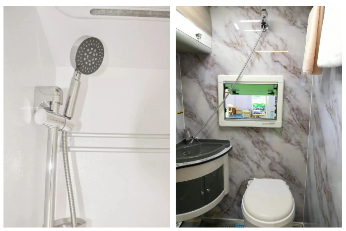 单独卫生间内有一组横向安置柜可存放洗漱用品,镜子、洗手盆、毛巾架、淋浴花洒、自带黑水箱的便携式马桶等设施,车顶安装了换气扇加强空气流通排除异味。