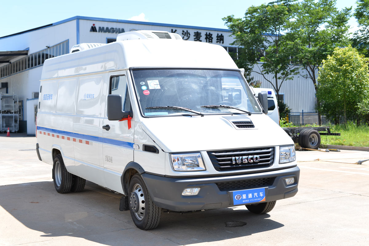 星通疫苗运输车采用依维柯底盘,隔热保温厢体(聚氨酯材料、不锈钢、铝合金板等),制冷机组(双冷机,一用一备),车厢内温度监控可自动控温等部件组成。