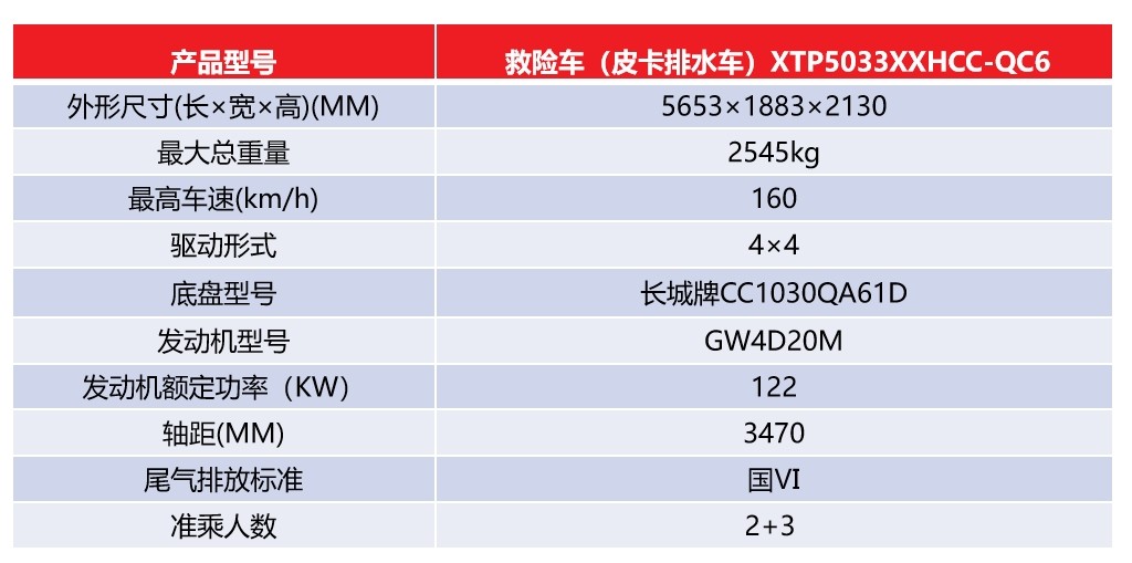 车型简介: 星通牌救险车(TP5033XXHCC-QC6)主要应用在应急抢险、消防、住建、市政、城管、水利、水务等领域。该车排水量500立方/小时,操作简单,机
