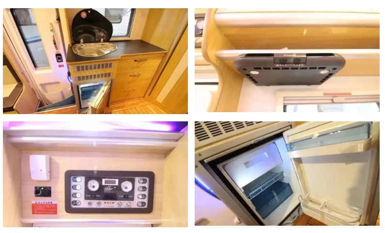 整车入口左侧是一个水池、砧板一体化的简易厨房操作台完美搭配外置厨房,水池内装有水龙头和燃气灶,灶台下方左侧是75L多美达车载冰箱,右侧是一组橱柜,灶台上方装有多美达油烟机、外推窗、吊柜。