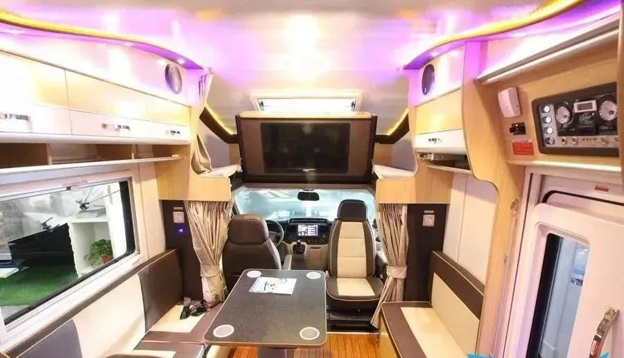 整车宽敞又舒适,布局巧妙,纯实木游艇柚木地板,车门上方就是整车电、水路的控制面板,车尾部分设有厕所和双人床,中部是三排软包沙发座椅,前部为宽敞驾驶室,整车共8座5卧,可用于商务接待、旅游、团建活动。