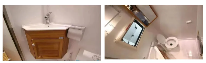 一体式卫生间卫浴设施齐全,淋浴龙头、洗脸盆、多美达抽拉式马桶、卫浴挂件、进口外挂淋浴器、40L黑水箱、60L灰水箱100L独立储热式热水箱、140L清水箱、梳妆镜和隐藏储物柜、卫生间内部还设有2.8kg滚筒洗衣机、车顶安装了双向换气扇加强空气流通排除异味。