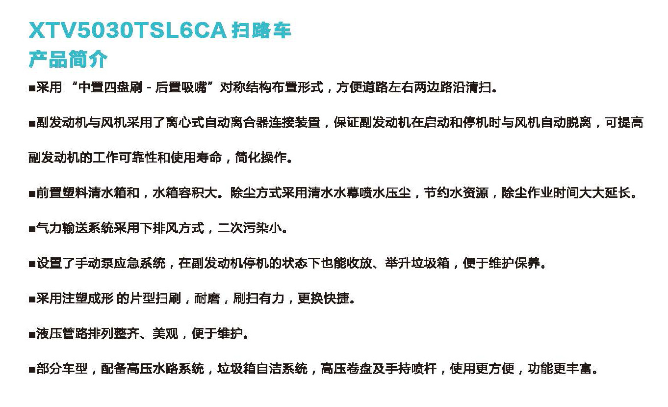 车型简介: 采用“中置四盘刷-后置吸嘴”对称结构布置形式,方便道路左右两边路沿清扫。