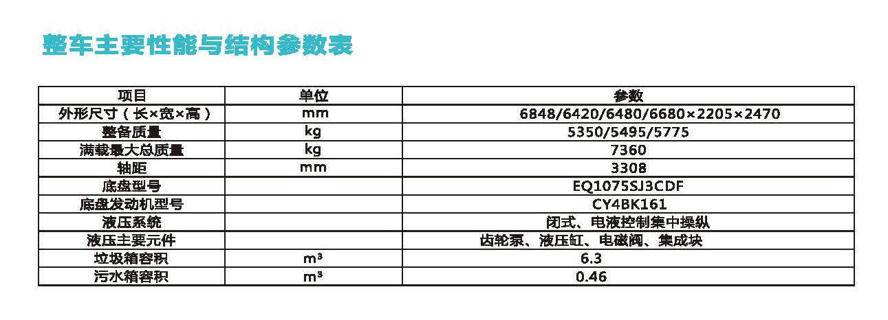车型简介: 适用于城镇居民区、社区、大型厂矿、机关院校等区域的桶装、袋装和散装生活垃圾的收集和转运。