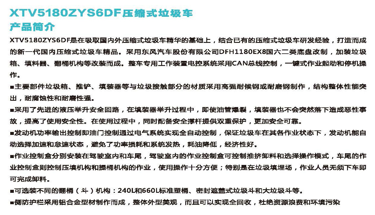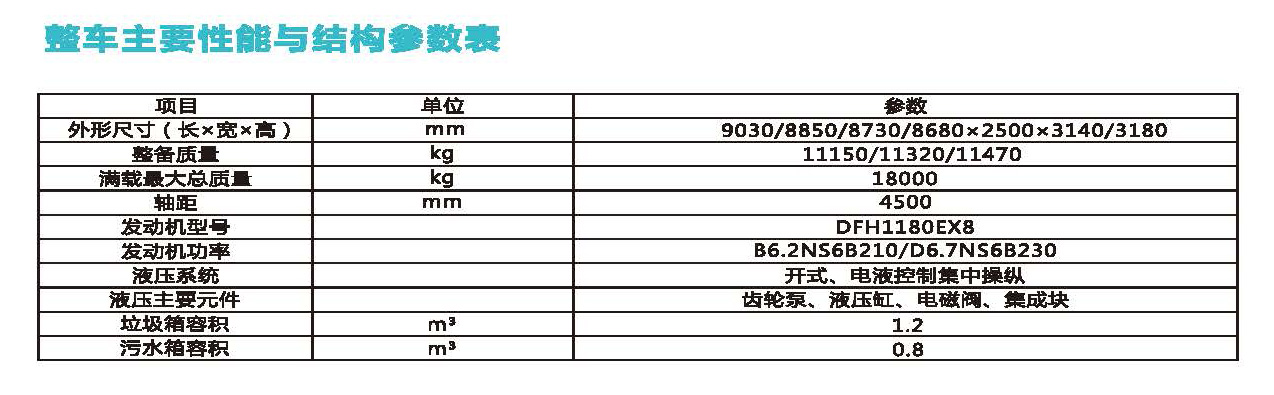 车型简介: 主要部件垃圾箱、推铲、填装器等于垃圾接触部分的材质采用高强耐候钢或耐磨钢制作,结构整体性能突出,耐腐蚀性和耐磨性强。