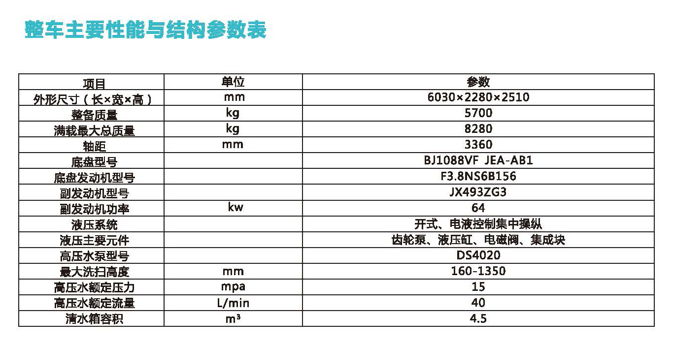车型简介: 主要适用于城市道路护栏的清洗,路面高压清洗和定点冲洗。