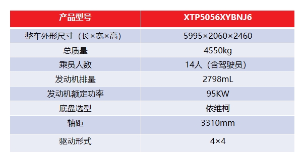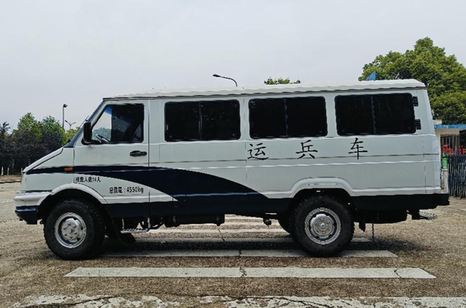 星通牌XTP5056XYBNJ6运兵车,该车采用依维柯NJ2056GCFP型4×4越野客车底盘作为载车平台进行改装改装,改装后可乘坐14人(含驾驶员),车内加装警用器械柜等专用装置,可选配免维护蓄电池、220V逆变电源、车载电台等设备,满足日常执勤任务需求,适用于反恐防暴突击、现场指挥、巡逻、运送警力,适用于新形势下应急部门快速反应和任务需求,及时进行警力投送,快速平息群体骚乱暴动、打击恐怖活动的特种车辆。